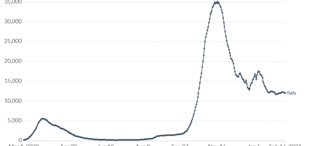 Figura 2. Numero di morti per Covid-19 in Italia nel 2020 e 2021 (media di 7 giorni; fonte: Johns Hopkins University)