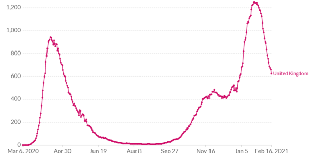 Figura 3. Numero di morti per Covid-19 nel Regno Unito nel 2020 e 2021 (media di 7 giorni; fonte: Johns Hopkins University)