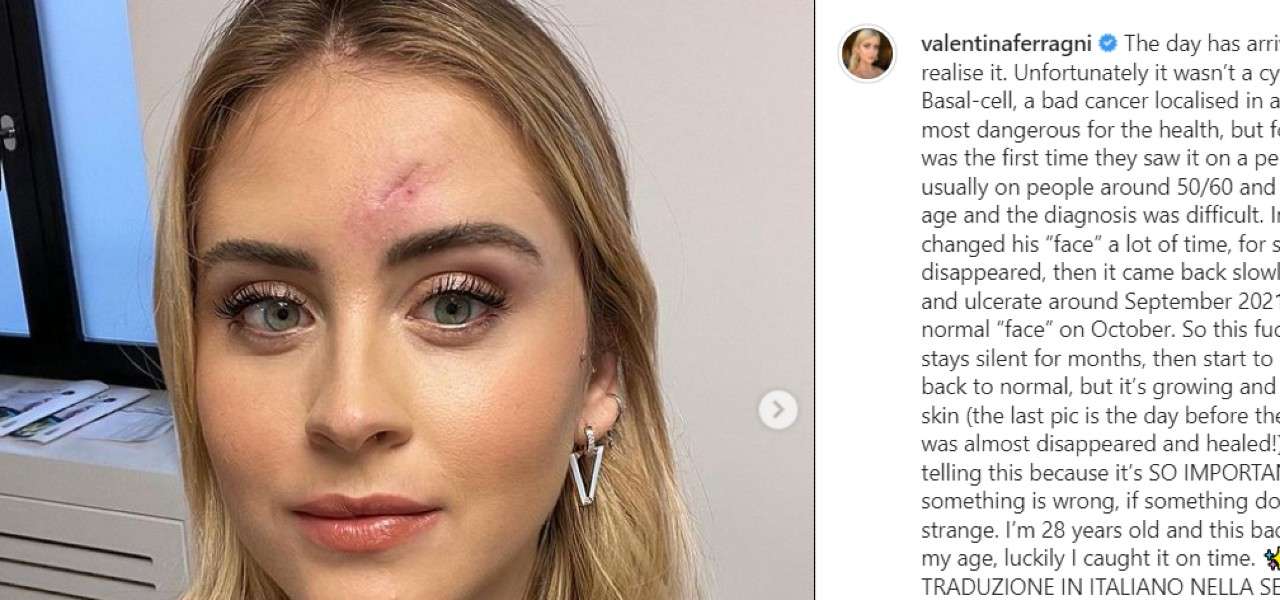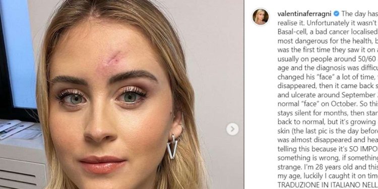 Valentina Ferragni e la malattia: la influencer ha scoperto di avere un carcinoma basocellulare. Sui social la confessione e il consiglio di fare prevenzione. La sorella di Chiara Ferragni ha vissuto un momento davvero terribile della sua vita quando le è stato diagnosticato un tumore maligno della pelle. Da diverso tempo sui social la bella Valentina compariva con un cerottino sulla fronte dovuto a quella che sembrava essere una semplice ciste. Purtroppo in seguito a dei controlli più approfonditi, la Ferragni ha scoperto di avere un tumore. A confessarlo sui social è stata proprio lei: “il giorno è arrivato e ci ho messo un po’ a realizzarlo. Sfortunatamente non era una cisti, ma un carcinoma basocellulare, un tumore maligno localizzato in una specifica area, non dei più pericolosi per la salute, ma per la pelle”.