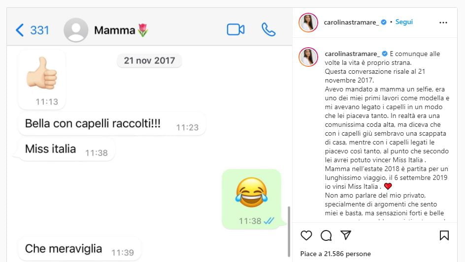 La madre di Carolina Stramare, nel messaggio incriminato, scrive: “Bella con i capelli raccolti”, per poi aggiungere: “Miss Italia”. E ancora: “Che meraviglia”. Carolina Stramare ha proseguito nel ricordo di mamma: “Nell’estate 2018 è partita per un lunghissimo viaggio, il 6 settembre 2019 io vinsi Miss Italia”.