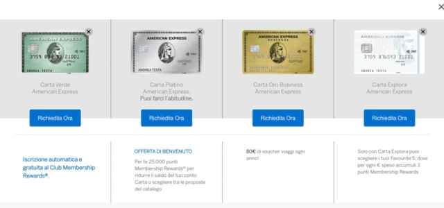 Abbiamo anche American Express Gold, gratuita il primo anno ed al secondo anno un canone mensile di €14. Poi abbiamo la carta platino American Express con €60 al mese che consente di fare acquisti senza alcun limite di spesa.