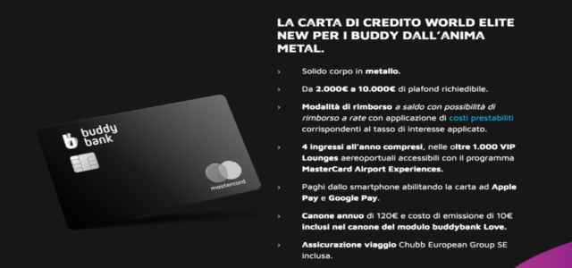 Anche Buddybank offre una carta di credito a fronte di un canone annuale fondamentalmente esigua, solo 120 euro per un plafond richiedibile da 2000 a 10 mila. Anche questa è una carta revolving, con possibilità di rateizzare gli acquisti, prevede inoltre 4 accessi VIP in aree areoportuali. Il can Buddybank è la banca on-line del gruppo UniCredit, uno dei più grandi gruppi al mondo.