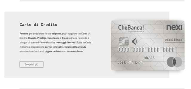 Tra le carte di credito gratuite abbiamo la carta di credito CheBanca che si differenzia in tre tipologie, Classic, Prestige e Excellence, il canone rispettivamente di 36,60 euro oppure €250 , ma in tutti e tre i casi l’importo e azzerabile se si rispettano alcuni requisiti. La Classic ha un massimale concedibile fino a €5000, Prestige da 5000 a €10000 ed Excellence da 10.000 a €25000. Tutte e tre hanno l’assicurazione sul cyber rischio e un’assicurazione per proteggere gli acquisti. Altra novità la possibilità di scelta tra il circuito Visa e MasterCard: questo caso che banca fa scegliere al cliente.