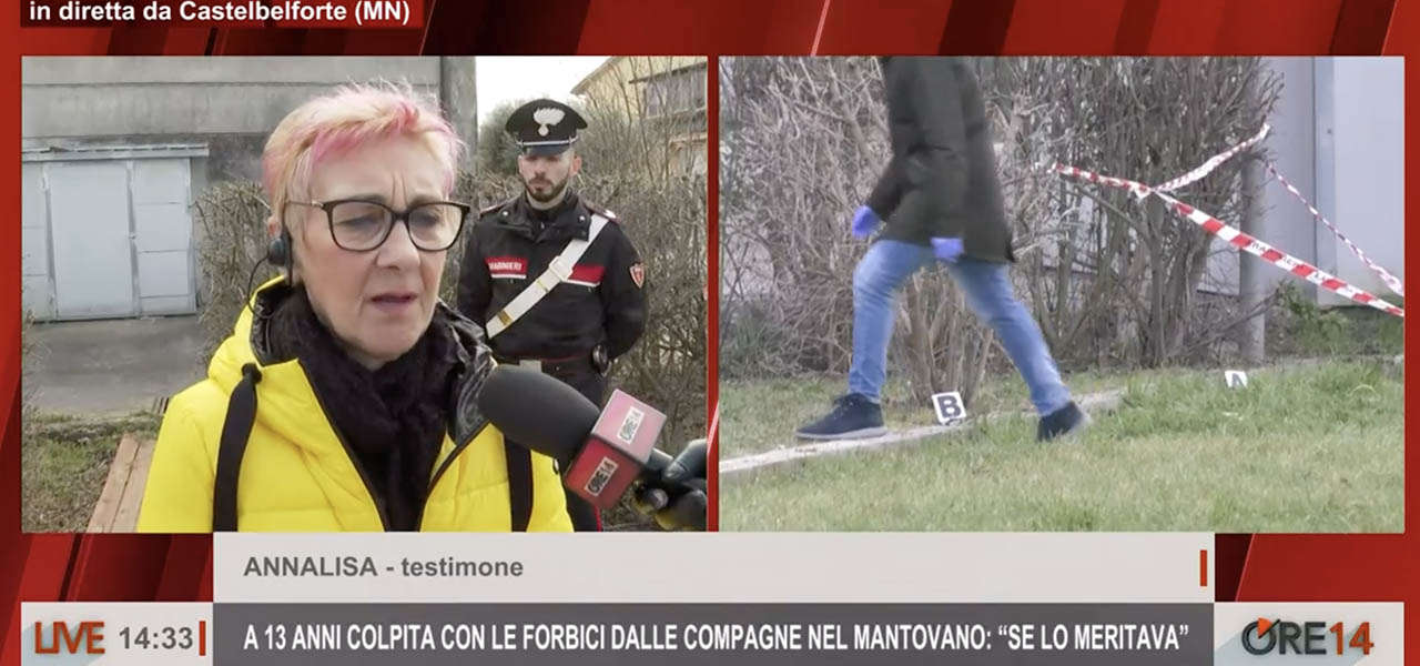 La donna che per prima è intervenuta sulla scena del ferimento della 13enne con delle forbici – colpita da due coetanee a Castelbelforte (Mantova) e ridotta in gravi condizioni – ha parlato dell’accaduto ai microfoni di Ore 14. Un racconto denso di particolari e molto importante, dal punto di vista investigativo, per ricostruire la dinamica della brutale aggressione che, secondo la madre della vittima e la stessa testimone, sarebbe potuta finire molto peggio addirittura con la morte della ragazzina.