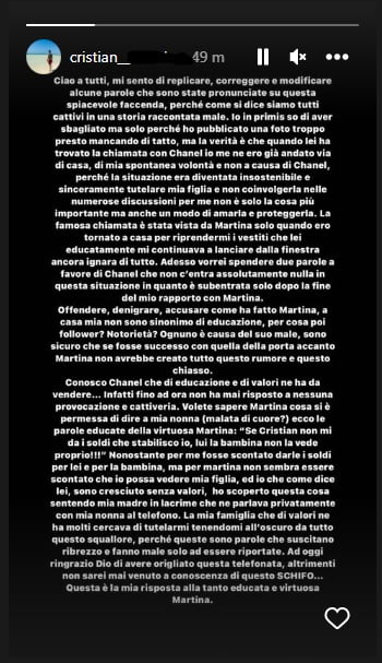Cristian difende a spada tratta Chanel Totti, accusando anzi la sua ex di aver fatto il nome della figlia di Francesco Totti e Ilary Blasi sono per avere popolarità. “Adesso vorrei spendere due parole a favore di Chanel, che non c’entra assolutamente nulla in questa situazione. – ha ulteriormente chiarito il ragazzo, lanciando dunque la stoccata all’ex – Perché offenderla e denigrarla, per ottenere follower e notorietà? Sono sicuro che, se questo fosse successo con qualcun altro, Martina non avrebbe creato tutto questo chiasso.” Cristian ha così concluso: “Conosco Chanel, che di educazione e valori ne ha da vendere. Martina invece si è permessa di dire a mia nonna, malata di cuore, che non mi avrebbe fatto vedere più la bambina se non le avessi dato i soldi che voleva. Per me era scontato darle soldi, per lei invece non era scontato che vedessi la bambina”.