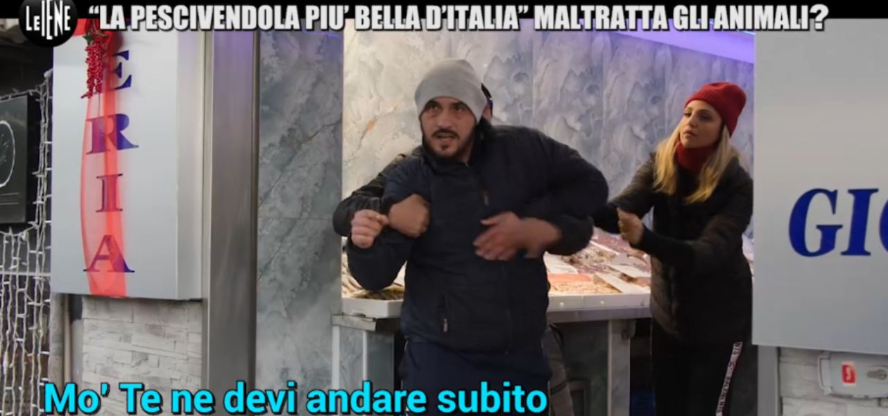 Intervenuti in prima persona nella pescheria di Carmela Febbraro, Rizzi e l’inviato delle iene Filippo Roma intratterranno con la ‘pescivendola più bella d’Italia’ e il marito Luigi un breve scambio di battute nel quale l’animalista ricorderà loro che con quei beceri video stanno commettendo “il reato di maltrattamento di animali [e] manifestazione non autorizzata” penalmente perseguito, notando anche che “fumate dentro una pescheria” nella quale vengono esposti i pesci pronti per la vendita.