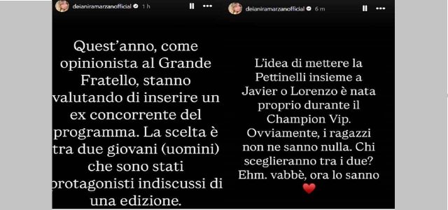 Secondo quanto fa sapere Deianira Marzano, dopo aver trascorso il weekend a Capri per il Vip Champion in compagnia di Anna Pettinelli e alcuni ex concorrenti del Grande Fratello, Alfonso Signorini starebbe pensando ad una clamorosa ipotesi: fare affiancare la Pettinelli da un ex concorrente del reality. Secondo quanto aggiunge la Marzano nell’indiscrezione pubblicata tra le storie del suo profilo Instagram, i nomi da valutare sarebbero quelli di Javier Martinez e Lorenzo Spolverato.