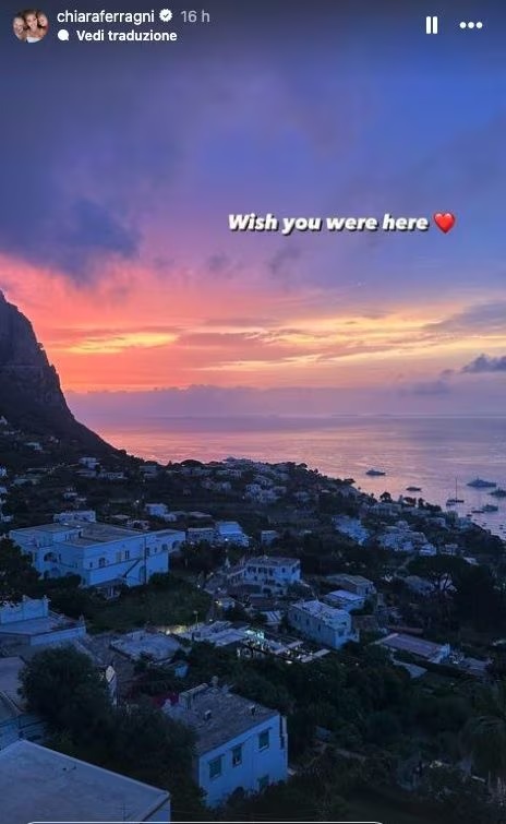 La foto in questione è quella di un bellissimo tramonto caprese, accompagnato da una frase che non è passata inosservata: “Wish you were here”, che tradotto significa “Vorrei che tu fossi qui”. Una chiara dedica d’amore, accompagnata da un cuoricino rosso che sottolinea l’entità del messaggio e porta a chiedersi: a chi è destinato?