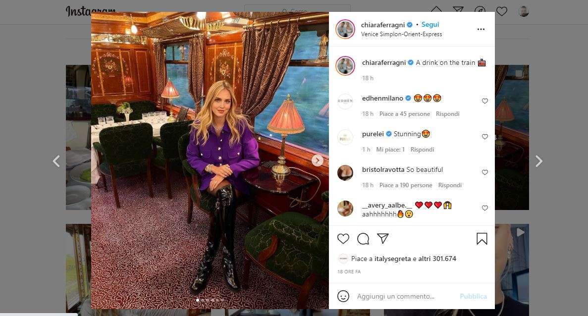 Chiara Ferragni ha realizzato il suo sogno da una vita, ovvero, fare un viaggio sul mitico Orient Express. Per coloro che non sanno di cosa si tratta, stiamo parlando dello storico treno il cui nome completo è Venice Simplon-Orient Express, un trenoche partendo da Venezia porta fino alla stazione Gare de l’Est di Parigi. Un viaggio da mille e una notte, visto che si attraversa su una motrice d’epoca il cuore dell’Europa, viaggiando in assoluta comodità dall’Italia alla Francia.