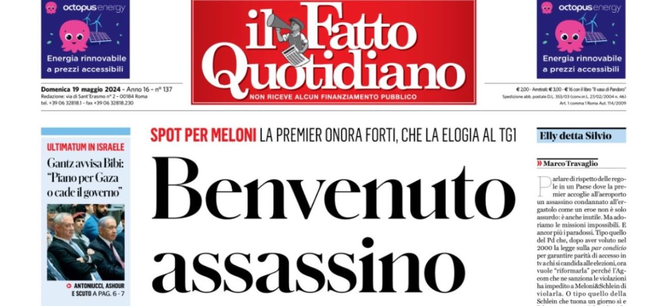 Il rientro di Chico Forti in Italia per scontare l’ergastolo a cui è stato condannato negli Stati Uniti per omicidio ha prodotto un cambio di rotta nel Fatto Quotidiano, perché quando M5s era al governo e lavorava per riportarlo nel nostro Paese, lo definiva un ex produttore che si è sempre dichiarato innocente, mentre ora ottiene una prima pagina con un titolo choc: «Benvenuto assassino». Nel mirino del giornale, più che il detenuto, c’è la premier Giorgia Meloni e l’accoglienza che gli ha riservato, anche perché pare che una delle richieste del Dipartimento di Giustizia Usa e della Casa Bianca fosse quella di evitare la spettacolarizzazione dell’arrivo di Chico Forti, evidentemente disattesa secondo il giornale diretto da Marco Travaglio, secondo cui la “trattativa” con gli Stati Uniti si sarebbe sbloccata col ritiro della candidatura di Ron DeSantis, governatore della Florida, dalle primarie repubblicane e per il filo diretto col presidente americano Joe Biden.