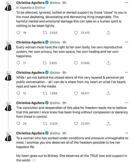Christina Aguilera ha allora proseguito, facendo notare che “Il danno mentale ed emotivo che tutto questo può causare a una persona non va preso alla leggera.”. La cantante, pur ammettendo di non conoscere bene i retroscena della vicenda, su Britney fa notare: “La convinzione e la disperazione della sua richiesta di libertà mi fa credere che questa persona, che una volta ho conosciuto, abbia vissuto senza compassione o onestà da parte di chi aveva il controllo della situazione. È una donna che ha lavorato a condizioni e sotto una pressione inimmaginabile per la maggior parte del tempo, e vi assicuro che si merita tutta la libertà possibile per vivere serenamente.” Così ha concluso: “Il mio cuore è con Britney, si merita tutto l’amore e il supporto del mondo”.