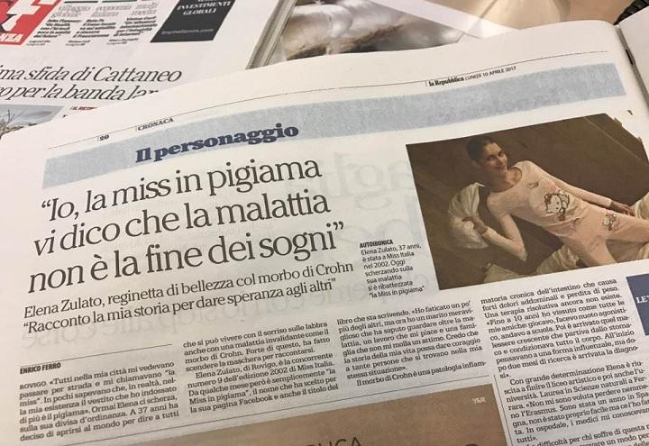 Morbo di Crohn, cosè’? Elena Zulato racconta la sua malattia con “La Miss con il pigiama” – Nel 2002 è stata una delle finaliste di Miss Italia, oggi Elena Zulato ha 39 e una rara patologia invalidante chiamata morbo di Crohn. “La malattia di Crohn è un’infiammazione cronica che può colpire teoricamente tutto il canale alimentare – spiega il portale della Società Italiana Unitaria Colonproctologia – che si localizza prevalentemente nell’ultima parte dell’intestino tenue chiamato ileo (ileite) o nel colon (colite) oppure in entrambi (ileo-colite). Nei tratti intestinali colpiti si hanno infiammazione, gonfiore ed ulcerazioni che interessano a tutto spessore la parete intestinale”. Elena ha scoperto di avere questa patologia all’età di 10 anni, cosa che tuttavia non l’ha mai fermata. Ha portato avanti gli studi, ha fatto un Erasmus, ha partecipato a Miss Italia arrivando in finale e oggi, su questa rara patologia ha deciso di scriverne e raccontare la sua esperienza e quella di altri come lei.