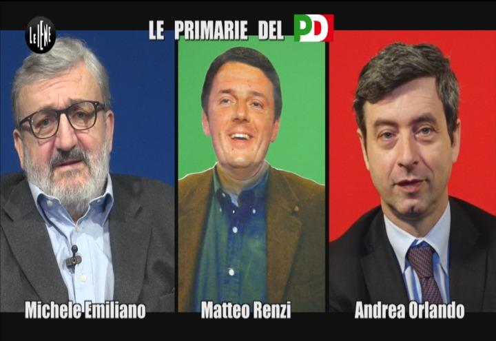Il programma Le Iene Show ha organizzato un confronto tra i tre principali candidati alle primarie PD: Michele Emiliano, Andrea Orlando e Matteo Renzi. Purtroppo quest’ultimo ha prima dato la sua disponibilità al microfono di Filippo Roma, per poi negarsi attraverso il proprio ufficio stampa. Le Iene hanno quindi deciso di farlo partecipare comunque, in veste di “cartonato”. Secondo Emiliano, Renzi “ha avuto paura degli italiani”, mentre Orlando è più preciso: “È perché ha paura di me”. I due l’hanno invitato a un confronto, ed Emiliano lo ha spronato così: “Matteo, ma ogni tanto ci dovremo pur vedere, no? Che pensi?”. Nessuno dei due vede ovviamente in Renzi il vincitore, ma in caso si sbagliassero Orlando ed Emiliano hanno entrambi dei consigli pronti: per il primo la priorità è cambiare la legge elettorale, per il secondo Matteo deve “smettere di correre senza sapere dove va”. I due hanno poi continuato l’intervista senza il terzo incomodo (cartonato) ed Emiliano si è detto pronto ad allearsi proprio con Orlando qualora non ottenesse lui stesso il 50% dei voti. Emiliano ha anche detto di preferire Orlando a Renzi, mentre il suo avversario pensa solo a vincere. In caso di vittoria, la prima cosa che l’attuale ministro della Giustizia intende fare è “una battaglia per debellare la povertà assoluta”, mentre il governatore della Regione Puglia vede prioritaria la riforma della legge sulla Buona Scuola voluta da Renzi