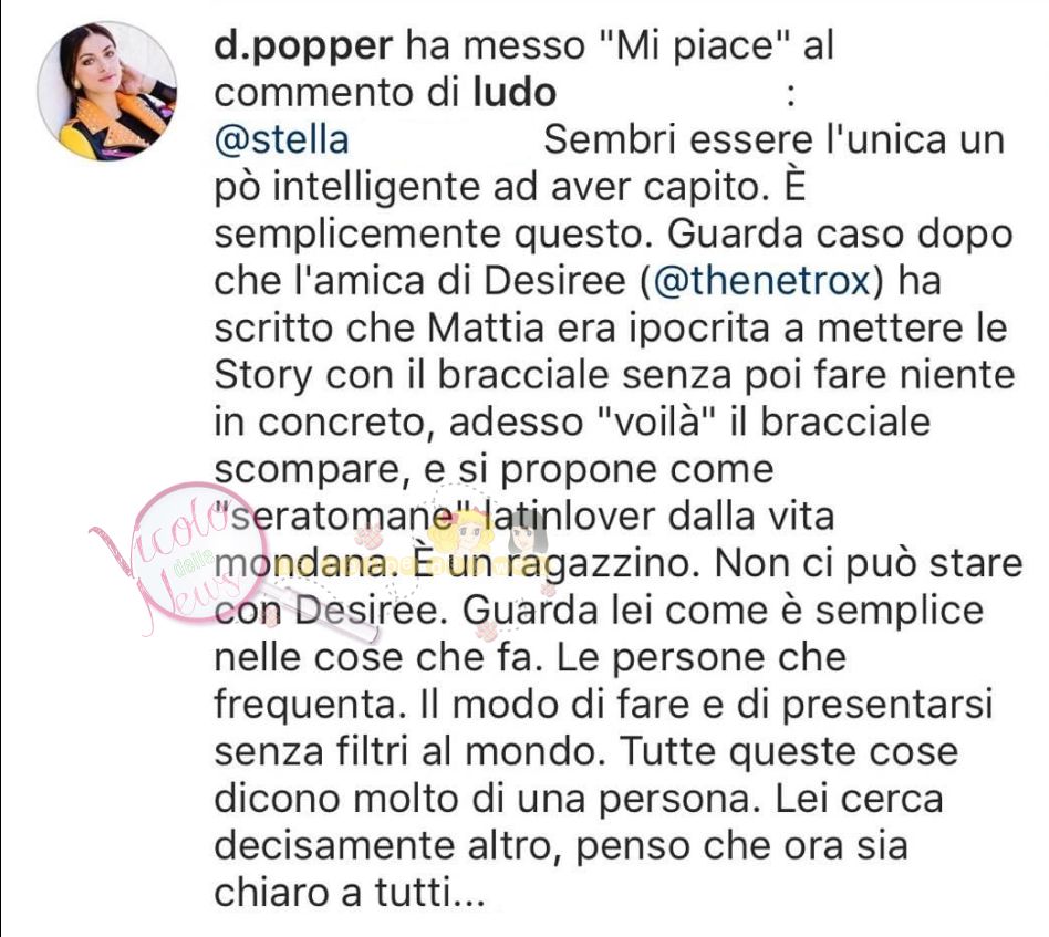 Ed intanto, Desirèe Popper ha allertato il popolo della rete per alcuni “passaggi” particolari proprio su Instagram dove ha messo alcuni “Mi piace” a dei commenti che in qualche modo screditavano senza mezzi termini, il suo ex corteggiatore. Una utente infatti ha affermato che, se il ragazzo fosse stato davvero innamorato non avrebbe mostrato così tanta serenità sul web. Desirèe ha distribuito un paio di “Mi piace” ma, così come propone il VicoloDelleNews ha poi disattivato il profilo. Naturalmente però, al popolo della rete nulla è scappato! Cliccate qui per avere le prove. (Aggiornamento di Valentina Gambino)