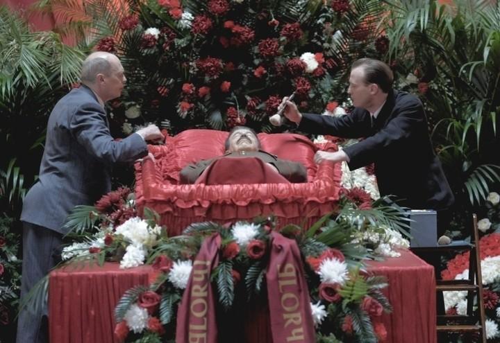 Stalin verrà trovato morto con il disco che sta girando sul grammofono. Morto? Berija fu il primo a entrare nello studio di Baffone e pare abbia ritardato i soccorsi. Berija era i braccio destro del tiranno, colui che compilava le liste di morte e dei gulag, il giustiziere. Qui è un cattivone incosciente che uccide e fa uccidere come se bevesse un bicchier d’acqua, cosa peraltro dimostratasi vera. Il resto della combriccola arriva al capezzale di Stalin più tardi, vogliono chiamare i migliori medici russi, ma questi o son morti o sono in Siberia. Si recuperano degli sfigati che ne decretano la morte. Ci sono anche i due figli, Vasilij che pensa solo alla vodka e Svetlana che pare viva in un altro mondo.
