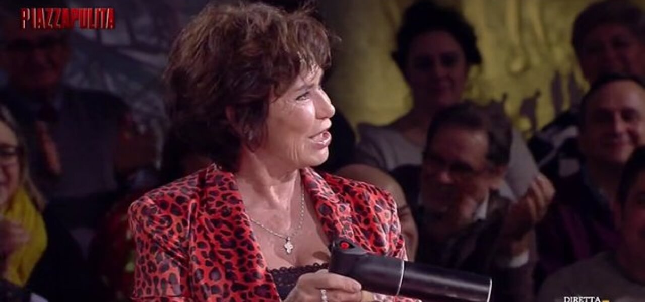 Corinne Clery ospite a Piazzapulita mostra la sua mega pistola al peperoncino che usa per difendersi "per non uccidere" visto che abita isolata in campagna e ha paura
