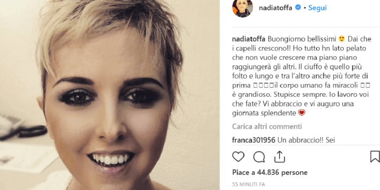 Nadia Toffa continua ad essere protagonista indiscussa sui social a quasi un anno dal malore che ha allarmato la famiglia, gli amici e i fan. Da allora sono passati diversi mesi in cui la conduttrice de Le Iene e giornalista si è curata, ha cercato di trasmettere positività alla gente annunciando il suo tumore in tv e mostrando i suoi progressi sui social. Anche questa è una di quelle giornate da incorniciare visto che la bella Nadia Toffa si è mostrata in tutto il suo splendore proprio sui social in una foto in cui rivela che i capelli le stanno ormai crescendo anche se c’è una parte, quella completamente rasata per l’intervento, che stenta ancora a farlo. Ma lei, lo sappiamo, non si da per vinta e continua a combattere come una leonessa in tv, sui social e con il suo nuovo libro che tanto scompiglio ha portato tra gli addetti ai lavori.