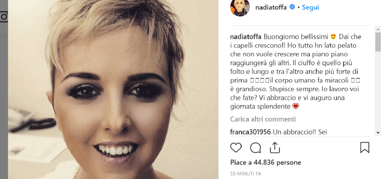 Nadia Toffa appare felice, in buona salute e con il suo splendido sorriso mostrando la ricrescita dei suoi capelli e scrivendo: “Buongiorno bellissimi ? Dai che i capelli crescono!! Ho tutto hn lato pelato che non vuole crescere ma piano piano raggiungerà gli altri. Il ciuffo è quello più folto e lungo e tra l’altro anche più forte di prima ????il corpo umano fa miracoli ?? è grandioso. Stupisce sempre. Io lavoro voi che fate? Vi abbraccio e vi auguro una giornata splendente“. Sicuramente i fan hanno apprezzato il suo nuovo scatto e l’hanno trovata bellissima invitandola ad andare avanti nella sua battaglia condividendo sempre con loro i suoi progressi. Adesso che Nadia Toffa si è mostrata così sui social farà a meno della parrucca in tv e si mostrerà in tutto il suo splendore o per questo c’è ancora tempo? Lo scopriremo nella prossima puntata de Le Iene Show.