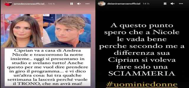 Amedeo Venza, infatti, in una storia pubblicata su Instagram, ha scritto: “Ciprian va a casa di Andrea Nicole e trascorrono la notte insieme. Oggi si presentano in studio e svelano tutto. Anche questo, per me, vuol dire prendere in giro il programma. E vi dico un’altra cosa: lui tra qualche settimana la lascerà perchè vuole il trono che non avrà mai”. Deianira Marzano, invece, ha augurato felicità ad Andrea Nicole.