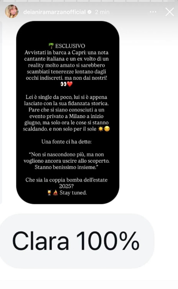 È Deianira Marzano a lanciare il gossip, diffondendo una segnalazione ricevuta da un utente secondo il quale Clara sarebbe stata avvistata in barca a Capri con “un ex volto di un reality molto amato”. I due, secondo l’indiscrezione, “si sarebbero scambiati tenerezze lontano dagli occhi indiscreti. – e ancora – Pare che si siano conosciuti a un evento privato a Milano a inizio giugno, ma solo ora le cose si stanno scaldando.” Entrambi sarebbero single ed è Deianira a confermare che la ragazza in questione è proprio Clara.
