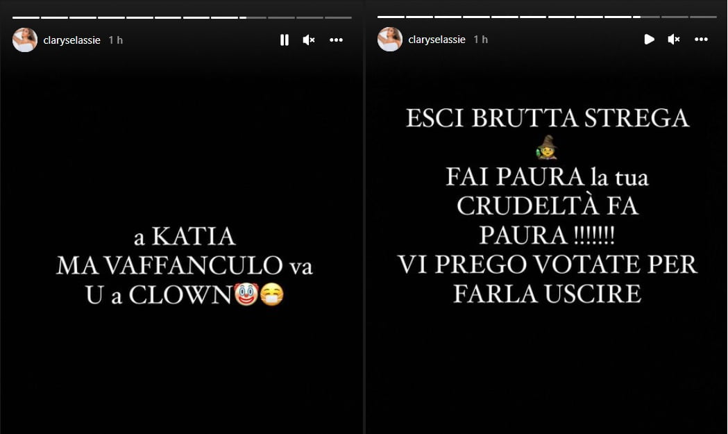 Ma cosa ha scritto Clarissa Selassiè in questi messaggi? Nel primo la minore delle tre sorelle dice: “Ma vaffanc*lo va, una clown!” Poi prosegue: “Esci brutta strega. Fai paura per la tua crudeltà!! Vi prego votate per farla uscire”, scrive dunque prima dell’esito del televoto. Poi, a esito arrivato, esulta: “Festeggerò annualmente questa data! Godo alla faccia tua, razzista!” Un comportamento che Signorini ha definito in diretta indice di una grande maleducazione, facendolo notare anche alle sorelle in Casa. La stessa Katia ha commentato, sorridendo, a tono: “Questa ragazza non ha intelletto nel suo cervello!”