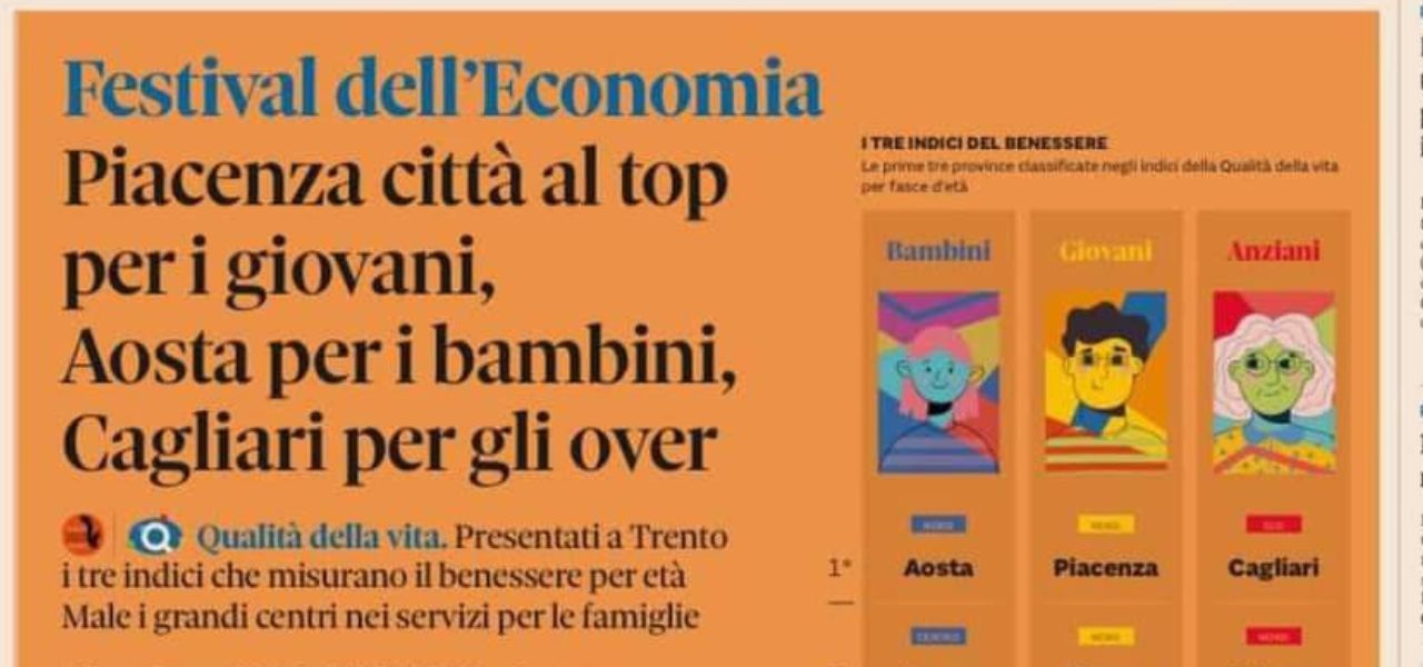 Il Sole 24 Ore ha stilato la classifica della qualità della vita per generazioni. Piacenza è prima per i giovani mentre Aosta in pole per i bambini