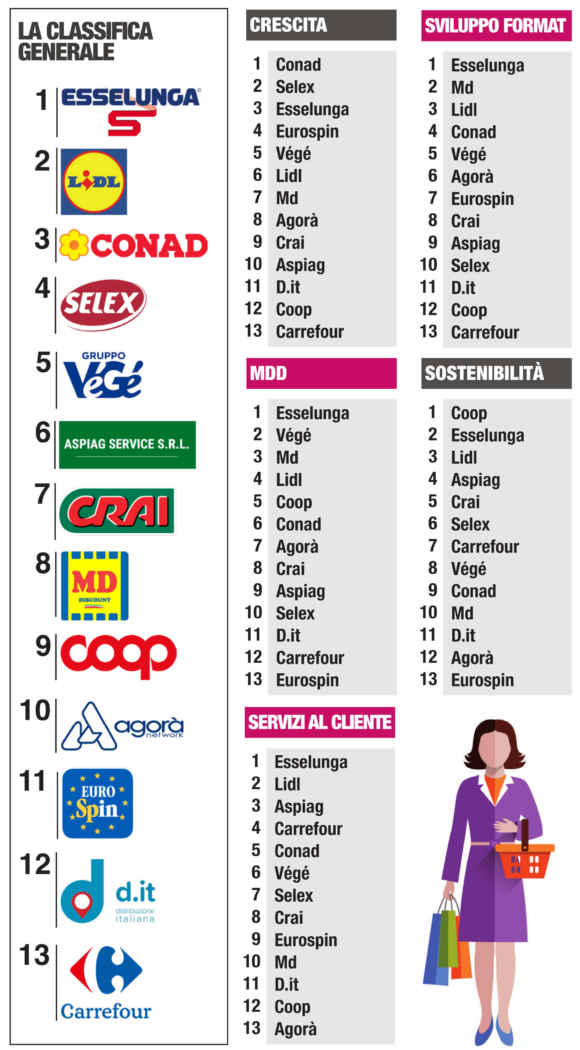 Alle spalle della catena fondata da Bernardo Caprotti, nella classifica generale si posizionano Lidl, che raccoglie ottimi voti su tutti i fronti, in particolare in tema di sviluppo del modello e di sostenibilità, e Conad, che nella sua veste di leader di mercato con una quota del 15% nel 2021, investe in un continuo progresso del format.