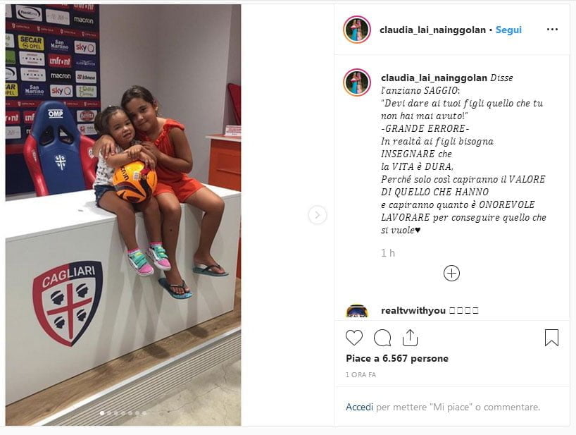 Torna allo scoperto Claudia Lai, la moglie dell’ex centrocampista dell’Inter e della Roma, Radja Nainggolan, tornato a Cagliari durante la sessione di calciomercato in corso. La signora del Ninja ha pubblicato attraverso il proprio seguitissimo profilo Instagram, uno scatto con protagoniste le due figlie, bimbe che Claudia ha avuto da Radja: la primogenita Aysa, nata nel 2011, e la piccola Mailey, nata cinque anni dopo. Entrambe sono state immortalate in quella che sembrerebbe essere a tutti gli effetti la sala stampa del Cagliari. Le due bimbe sono state fotografate sedute sulla scrivania e con un pallone in mano, sorridenti e felici. Annessa agli scatti, Claudia ha deciso di postare un messaggio profondo: “Disse l’anziano saggio: “Devi dare ai tuoi figli quello che tu non hai avuto”. GRANDE ERRORE!!! In realtà ai figli bisogna insegnare che la vita è dura, perchè solo così capiranno il valore di quello che hanno e capiranno quanto è onorevole lavorare per conseguire quello che si vuole”.