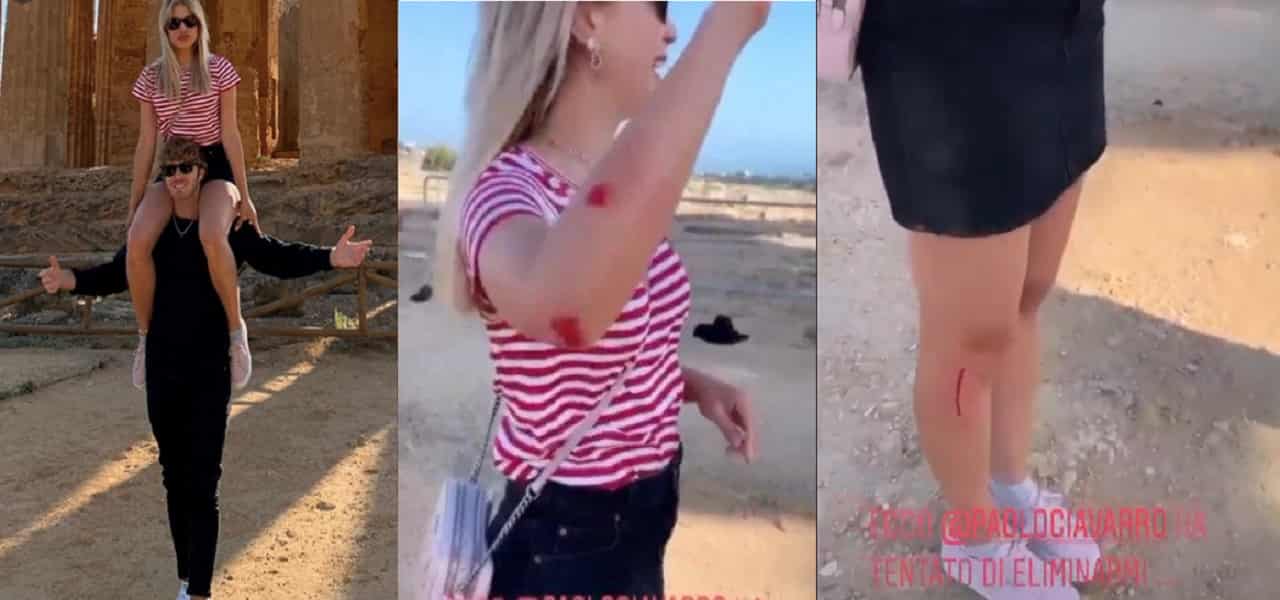 Paolo Ciavarro voleva immortalare il suo passaggio nella Valle dei Templi con una foto artistica, ma a farne le spese è stata Clizia Incorvaia che ha riportato una serie di escoriazioni su gambe e braccia come mostra lei stessa su Instagram. “Prima che Paolo Ciavarro tentasse di eliminarmi“, ha scritto in una prima storia per poi mstrare le ferite ai followers. Paolo, però, ha tentato di difendersi scatenando la pronta reazione di Clizia. “E per fare il figo e per fare la foto artistica proposta da Ciavarro” – dice Clizia che poi aggiunge – “Io non sono capace? Ragazzi, sono ridotta.. non lo so. Adesso dovrà farsi perdonare”. Il tutto, però, viene raccontato con il sorriso dalla Incorvaia che, divertita dalla disavventura vissuta con il fidanzato, ha voluto rendere partecipe i suoi fans del suo piccolo incidente.