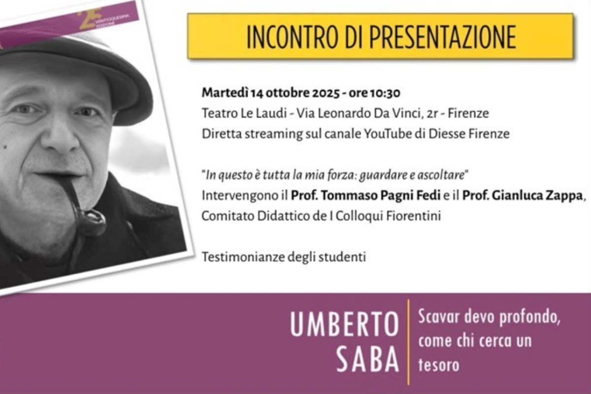 Si terrà alle ore 10.30 l’incontro presso il Teatro Le Laudi di Firenze, con la possibilità della diretta video streaming su canale YouTube di Diesse Firenze (e in onda anche sul Sussidiario.TV): interverranno nel dialogo Tommaso Pagni Fedi e Gianluca Zappa del Comitato Didattico Nazionale, presentando la relazione dal titolo “In questo è tutta la mia forza: guardare e ascoltare”. Il percorso avviato dei Colloqui Fiorentini 2026 è dedicato all’opera del poeta triestino Umberto Saba, seguendo il tema fissato dal titolo “Scavar devo profondo, come chi cerca un tesoro”.