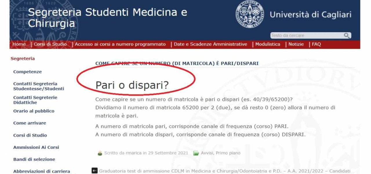 Un avviso pubblicato dall’Università di Cagliari sul suo sito ufficiale è diventato un caso nazionale. Questo perché è a dir poco surreale. La vicenda è stata segnalata dall’agenzia di stampa Dire: su uno dei portali dell’ateneo sardo è apparsa una minuziosa spiegazione della differenza tra pari e dispari. Un tentativo per far comprendere ai neoiscritti a quale gruppo appartengono. “Dividiamo il numero di matricola 65200 per 2 (due), se dà resto 0 (zero) allora il numero di matricola è pari” – si legge nell’avviso, che poi prosegue – “A numero di matricola pari, corrisponde canale di frequenza (corso) PARI. A numero di matricola dispari, corrisponde canale di frequenza (corso) DISPARI”.