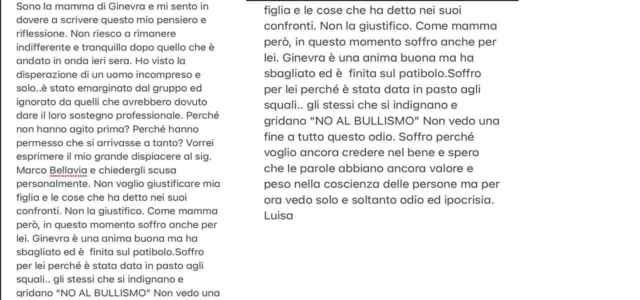 “Non voglio giustificare mia figlia e le cose che ha detto nei suoi confronti. Non giustifico. Come mamma però in questo momento soffro anche per lei. Ginevra è un’anima buona ma ha sbagliato ed è finita sul patibolo. Soffro per lei perchè è stata data in pasto agli squali… gli stessi che s’indignano e gridano “NO AL BULLISMO”. Non vedo una fine a questo odio. Soffro perchè voglio ancora credere nel bene e spero che le parole abbiano ancora valore e peso nella coscienza delle persone ma per ora vedo solo odio ed ipocrisia“, conclude la signora Luisa.