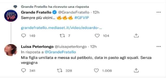 “Mia figlia umiliata e messa sul patibolo, data in pasto agli squali. Senza vergogna. Non hanno idea del danno che hanno fatto”, ha scritto Luisa Peterlongo sotto un post Twitter del Grande Fratello Vip. La mamma di Ginevra, poi, ha aggiornato i fan sulle condizioni della figlia: “Come sta Ginevra? E’ tanto dispiaciuta, senza parole. E’ sconvolta”.