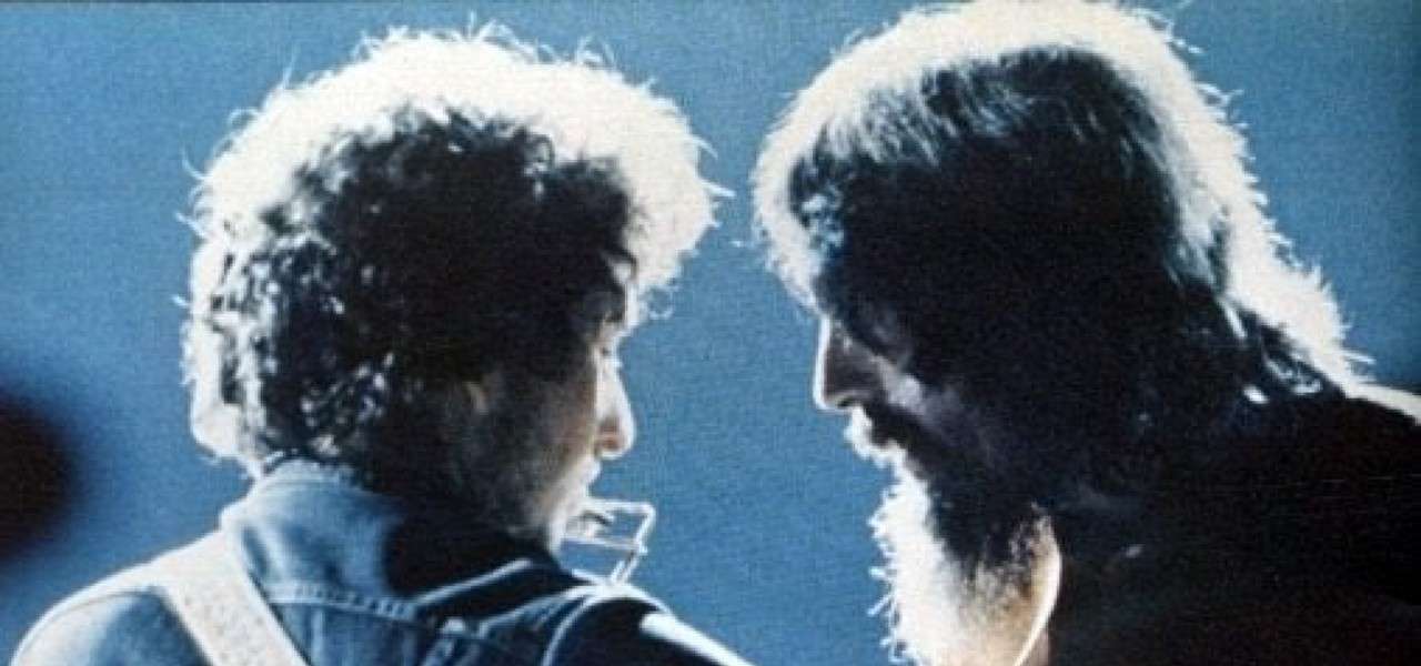 A quel punto Harrison annunciò un brano per sole chitarre acustiche e accompagnato dai Bad Finger propose un altro brano pubblicato con i Beatles per la prima volta dal vivo, la deliziosa Here comes the sun. Presa poi la chitarra elettrica, l’ex Beatle guardò il foglietto attaccato con lo scotch sul retro dove era scritto “Bob” con il punto di domanda, tanto non era certo che il celebre cantautore si sarebbe esibito. Invece salì sul palco con una giacca di jeans, evidentemente nervoso come disse Harrison in seguito: “Fu solo in quel momento che seppi che si sarebbe esibito”. Accolto da boati di gioia impazzita, accompagnato discretamente da Harrison, Russell al basso e Ringo Starr al tamburello, Dylan eseguì cinque di quelle sue canzoni che avevano definito gli anni 60: Hard rain, Blowin’ in the wind, It takes a lot to laugh, it takes a train to dry, Love manus zero/No limit e Just like a woman.