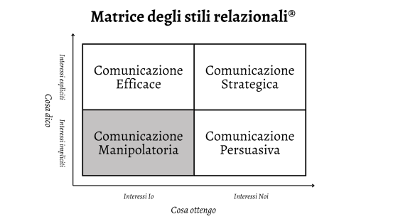 Proseguiamo il ciclo di articoli dedicato alla matrice degli stili relazionali®, uno strumento che codifica i quattro stili relazionali utilizzabili, più o meno consciamente, nella vita professionale e personale. Se nel precedente articolo abbiamo evidenziato i limiti della Comunicazione Efficace, questa volta parliamo della Comunicazione Manipolatoria.