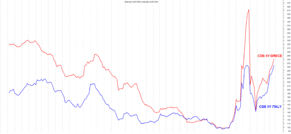 Andando inoltre a quantificare l’eventuale assicurazione quale protezione per il rischio Paese (Credit Default Swap a 5 anni) si assiste a una dinamica di prezzo che oggi vede affiancate l’Italia e la Grecia. Dopo i minimi registrati lo scorso febbraio (entrambi i Paesi registravano valori inferiori a 100), si può notare come a metà marzo ci sia stato un significativo incremento della Grecia (oltre 400 punti) rispetto a un’Italia a quota 258. Nell’arco delle successive giornate, il Paese ellenico, ha visto un positivo ritracciamento che lo ha riportato in prossimità di area 145 (al pari del nostro Paese), mentre, dallo scorso 26 marzo, è evidente, un chiaro parallelismo (crescente) tra i due andamenti.