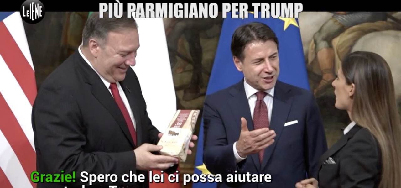 Dazi sul parmigiano reggiano, irruzione Le Iene durante incontro Giuseppe Conte-Mike Pompeo: video. Poi premier fa pace con Alice Martinelli, ma avverte...