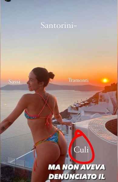 Qualche giorno fa, Aurora Ramazzotti è atterrata nella splendida Santorini per trascorrere una vacanza insieme al fidanzato Goffredo Cerza. La ragazza, che sui social è sempre molto attiva nonché particolarmente ironica, ha avvisato allora i suoi follower che, nei prossimi giorni, avrebbero visto solo tramonti (ben noti quelli di Santorini per la loro bellezza), sassi e ‘cul*’. Una battuta con la quale la Ramazzotti ha voluto ironizzare sulla presenza di bellissime ragazze sull’isola.