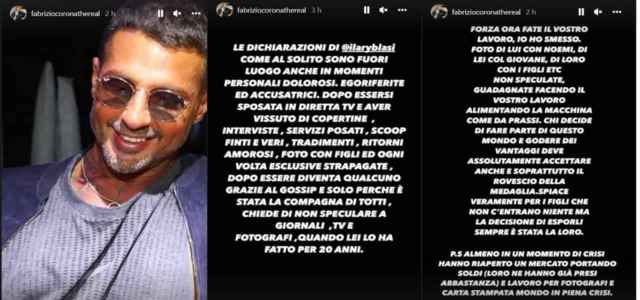 Non si sono fatte attendere le dichiarazioni di Fabrizio Corona sulla fine del matrimonio tra Ilary Blasi e Francesco Totti. Attraverso alcune storie pubblicate su Instagram, Corona ha commentato il comunicato con cui la Blasi ha ufficializzato la fine del matrimonio soffermandosi sulla richiesta di non speculare sulla sua vita privata per rispetto nei confronti dei figli. Dopo l’ufficializzazione della separazione da parte di Totti e Ilary, Corona rivolge prima un appello a giornalisti e fotografi e poi un messaggio alla stessa Blasi.