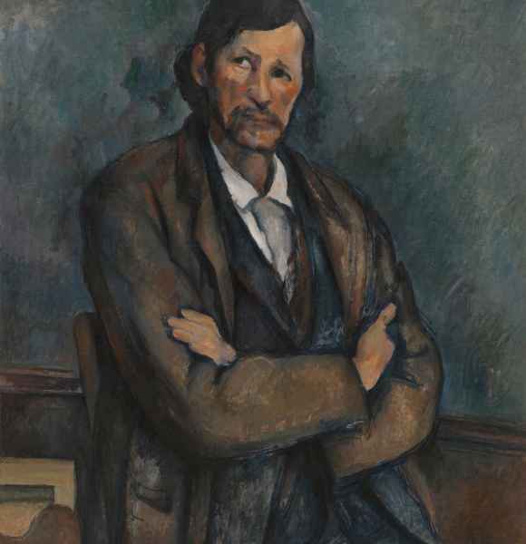 Se c’è una caratteristica che definisce la grandezza di Cézanne è quella di essere un artista che qualunque cosa affronti, si proietta sempre in una prospettiva biblica. Ed ha qualcosa di biblico anche questo ritratto, per quanto sia il ritratto di un borghese parigino. L’uomo dalle braccia conserte ha infatti un che di pacato e insieme di risoluto. Non lascia nessuna concessione agli estetismi. Sta con la schiena ben eretta, e con lo sguardo sembra operare determinatamente uno strappo: sposta il centro via da sé stesso e anche dal quadro. Sta guardando oltre, nella consapevolezza di tutte le battaglie che in quell’oltre si prospettano. È forte, come dimostra quel gesto un po’ sfidante di tenere le braccia conserte.