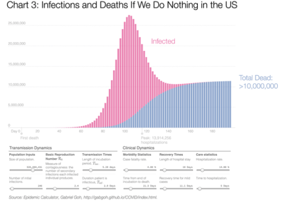 Il grafico (tratto da uno studio di grande interesse scientifico pubblicato da Tomas Pueyo), utilizzan un calcolatore epidemico on line che simula gli effetti di una strategia Do Nothing negli Stati Uniti: si rischiano 10 milioni di morti. Com’è possibile? Ipotizzando un R0 di 2,4 e un tasso di mortalità del 4% succede questo: 10 milioni di persone necessiteranno di ospedalizzazione e circa 3 milioni di terapie intensive. Negli Usa i posti totali di terapia intensiva sono 50.000 e i ventilatori polmonari meno di 100.000. Se il 5% dei tuoi ricoverati ha bisogno nello stesso momento di terapie intensive e il sistema sanitario non ha la capacità adeguata per rispondere, almeno il 4% dei pazienti morirà. Se il 75% della popolazione Usa (327 milioni) si infetta, abbiamo una platea di 245 milioni di malati. Se il sistema sanitario non riesce a offrire una risposta ospedaliera a tutti si stima un tasso di mortalità del 4%: 9,81 milioni di persone. Ora probabilmente sarà più chiaro come mai nel giro di dieci giorni nel Regno Unito si è passati da un approccio Do Nothing a un approccio Soppressione.