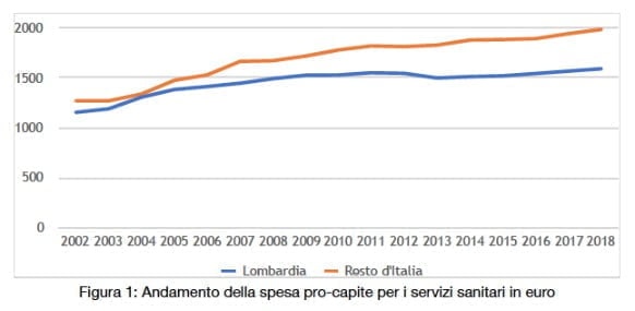 Vediamo alcuni dati che ci aiutano a comprendere la realtà. In primis, analizziamo se la compartecipazione di erogatori pubblici e privati alla sanità lombarda ha inciso sul costo pro-capite del servizio sanitario. Regione Lombardia ha aumentato la spesa sanitaria dal 2002 al 2018 (ultimo dato disponibile) passando da 12.710 milioni di euro a 19.866 milioni di euro con un incremento di spesa del 56%. Durante lo stesso periodo, la spesa sanitaria complessiva di tutte le altre Regioni è passata da 66.266 milioni di euro a 96.133 milioni di euro con un incremento del 45%. Ma se da un lato la spesa complessiva è cresciuta, è interessante osservare anche il grafico in Figura 1, che riporta l’andamento della spesa pro-capite per i servizi sanitari.