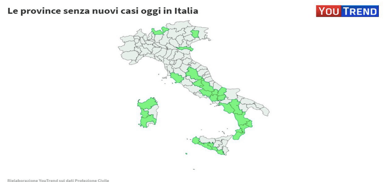 Ultimi dati sul coronavirus arrivati ormai alla vigilia della fase 2. La tendenza resta quella vista dall’inizio della pandemia, il Nord pesantemente coinvolto, nel Sud il covid-19 non ha sfondato in questa fase di fine inverno-inizio Primavera. Lo dimostra la mappa delle province “covid-free“, ovvero quelle che nelle ultime 24 ore non hanno fatto registrare nessun nuovo caso di contagio. Al Nord l’unica provincia che non ha fatto registrare nuovi casi di coronavirus è quella di Sondrio, una vera rarità nella Lombardia che resta la regione più duramente colpita di tutte dall’emergenza. Al momento un focolaio importante resta quello piemontese, con la regione infatti che fa registrare casi in tutte le sue province. Al Nord solo altre due province non hanno fatto registrare contagi di covid-19 nell’ultimo giorno, Rovigo in Veneto e Pordenone in Friuli Venezia Giulia: tutte le altre province covid-free della giornata sono a sud dell’Emilia Romagna.