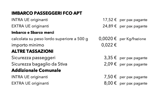 Se per l’Italia prendiamo come esempio l’Aeroporto di Roma Fiumicino, va detto che a partire dallo scorso 1° aprile i passeggeri in partenza devono affrontare nuove tasse aeroportuali, in particolare per i voli extra-Ue: è, infatti, previsto un aumento delle tasse aeroportuali compreso tra 0,50 e 8 euro per i voli diretti verso destinazioni al di fuori dell’Unione europea. Questa nuova tassa si applicherà agli aeroporti con un traffico annuale superiore a 10 milioni di passeggeri, tra cui per l’appunto Roma Fiumicino. L’obiettivo di questa misura è finanziare progetti di sviluppo urbano e riqualificazione edilizia nei comuni che ospitano gli aeroporti.