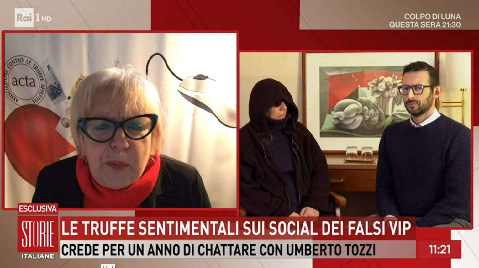 Storie Italiane è tornato a parlare stamane di truffe amorose ed in particolare della storia di Marisa che ha creduto per un anno di parlare con Umberto Tozzi attraverso un finto profilo Instagram. Il cantautore non c’entra assolutamente nulla con questa storia visto che all’artista si è sostituito un terzo che ha usato una sua foto. “Io sono una fan di Umberto Tozzi“, ha spiegato Marisa in diretta su Rai Uno che ha poi aggiunto di aver versato 17mila euro con dei vaglia postali, pagamento in Italia, per far arrivare nel nostro Paese una fantomatica valigetta.