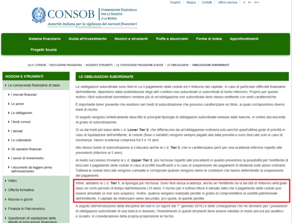 Per chi non avesse una specifica competenza in materia quest’ultima tipologia di strumenti finanziari si caratterizza per un elevato rischio con ovvio significativo ritorno in conto capitale (rif. cedola riconosciuta). Una sintetica descrizione è possibile ricavarla attraverso la consultazione del sito della Consob che, nella propria sezione dedicata all’educazione finanziaria, riporta le varie tipologie di obbligazioni tra cui le cosiddette “subordinate” ordinate per livello di rischio e con la loro specifica caratterizzazione: «Infine, abbiamo le c.d. Tier 1, la tipologia più rischiosa. Sono titoli senza scadenza, anche se l’emittente ha la facoltà di rimborso anticipato dopo un certo periodo di tempo dall’emissione (10 anni). Il rischio per il sottoscrittore è elevato dato che il pagamento delle cedole può essere annullato (e non solo sospeso). Inoltre, qualora vengano realizzate perdite in grado di compromettere la solidità patrimoniale dell’emittente, il capitale da rimborsare viene decurtato, pro-quota, di queste perdite».