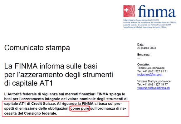 Sostanzialmente, è più sinteticamente, la ragion d’essere alla base dell’avvenuto azzeramento è da ricondurre a quanto indicato all’inizio dello stesso comunicato stampa: «L’Autorità federale di vigilanza sui mercati finanziari FINMA spiega le basi per l’azzeramento integrale del valore nominale degli strumenti di capitale AT1 di Credit Suisse. Al riguardo la FINMA si basa sui prospetti di emissione delle obbligazioni come pure sull’ordinanza di necessità del Consiglio federale».