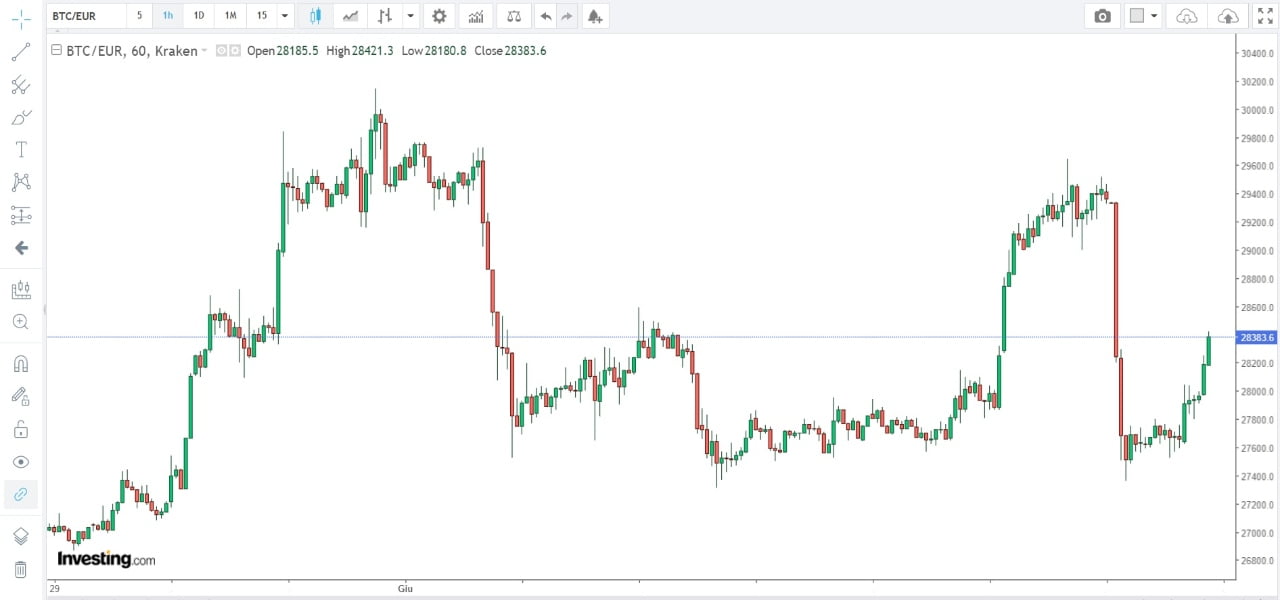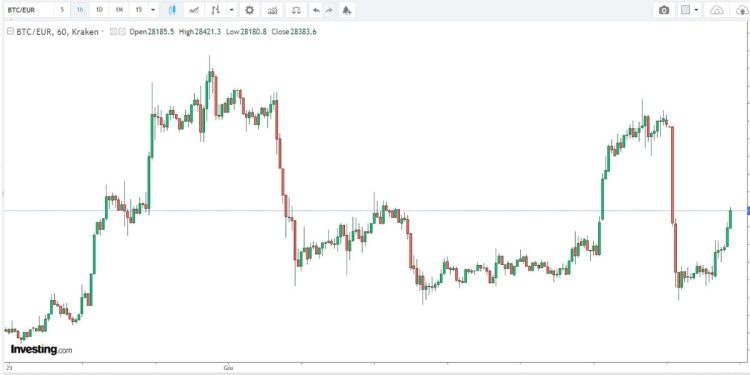 Criptovalute, il mercato recupera al crollo di ieri e Bitcoin ha delle fortissime oscillazioni ma raggiunge immediatamente i 28800 euro.