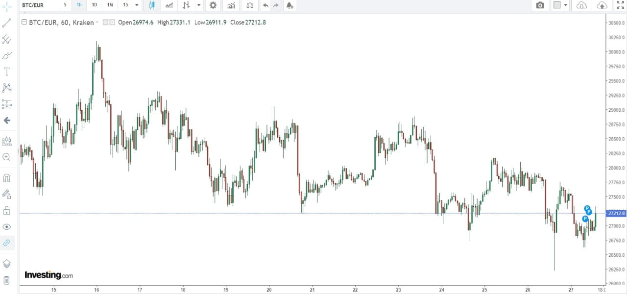 Oggi 27 maggio 2022 il bitcoin ha aperto a 27539, per poi precipitare immediatamente fino alle 8.00 del mattino, quando ha raggiunto il minimo di 26623. Adesso la criptovaluta ha raggiunto nuovamente 27214 euro.