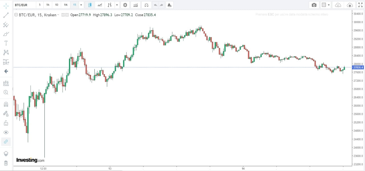 Sebbene Bitcoin (BTC) stia recuperando, la sua quotazione resta a 27978 euro, con una variazione giornaliera negativa al -2,63 %.